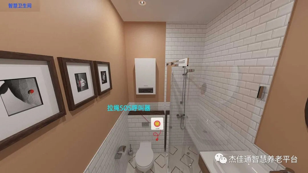 在衛生間安裝拉繩SOS呼叫器,當不舒適時,可以通過拉繩或者按下呼叫器按鈕,把求助信息發送到值班中心或者子女手機上。