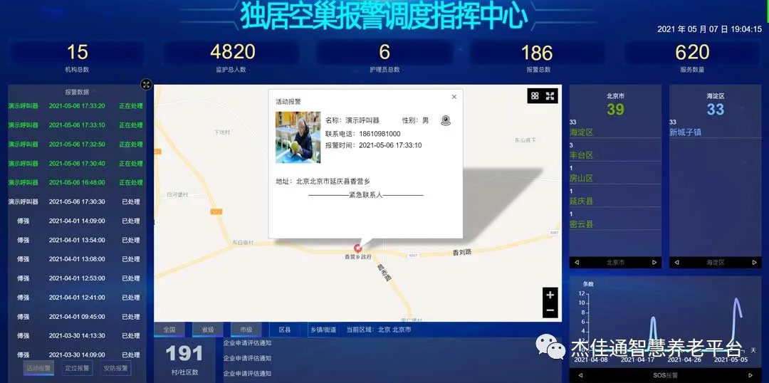 1、在茶幾上、過道、餐桌旁、廚房內粘貼SOS呼叫器或者拉繩SOS呼叫器按鈕。當老人出現異常時,老人隨手拍一下,即發出救助呼叫信息,智慧調度值班中心大屏上即時彈出老人的詳細信息;子女手機上也即時提示老人異常信息。